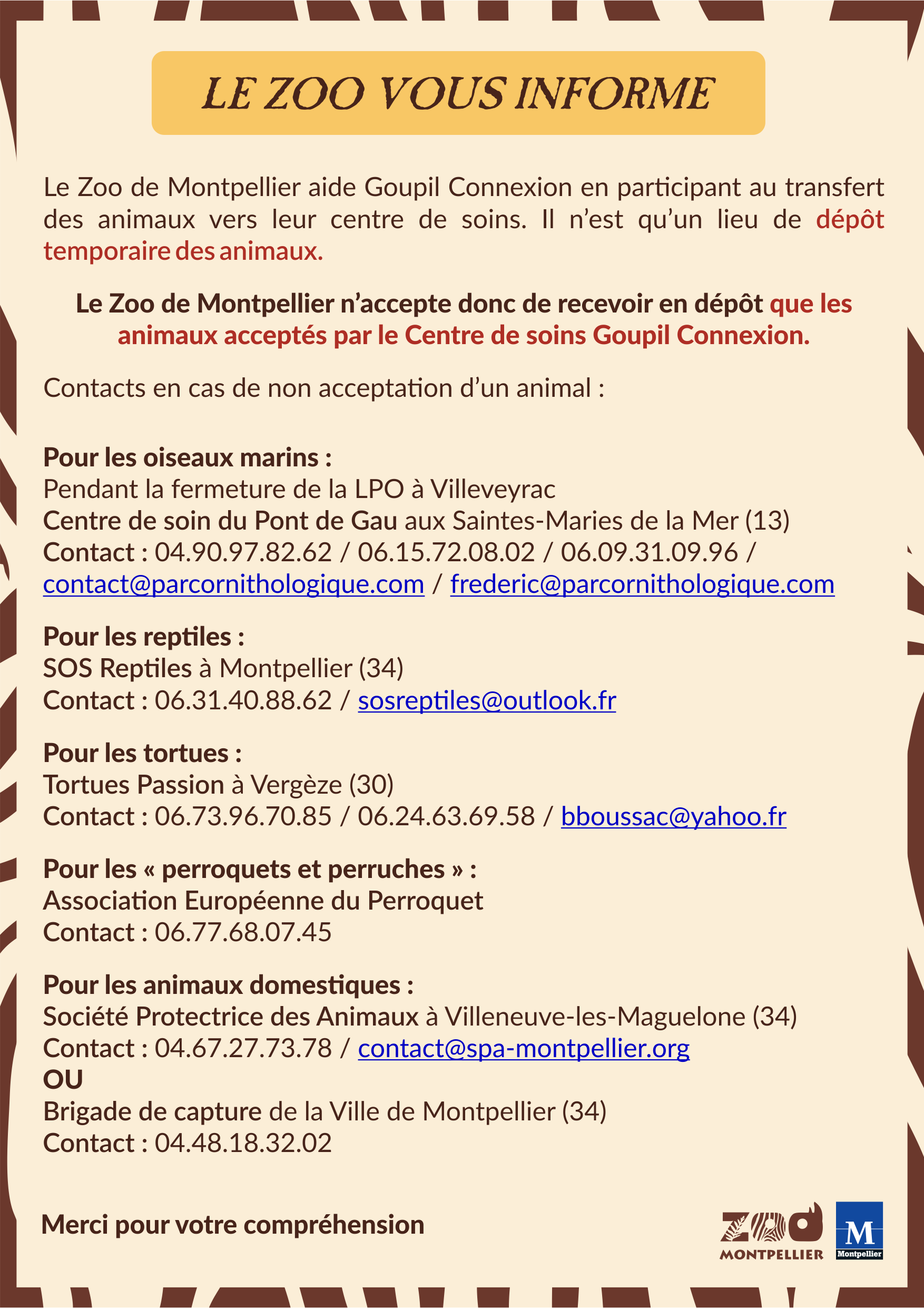 Si l'animal que vous avez récupéré n'est pas accepté, ne l'apportez pas au Zoo de Montpellier ou chez Goupil Connexion. Dans ce cas, contactez un établissement adapté, voir ici.